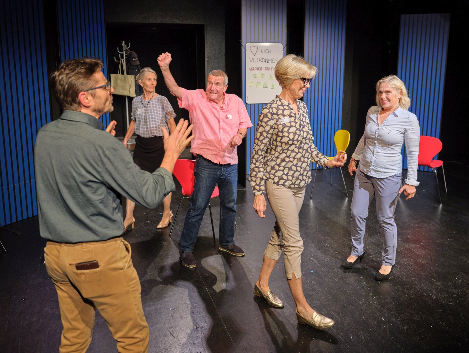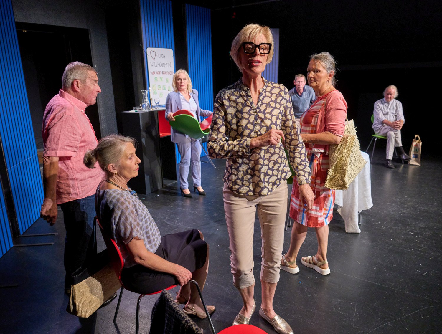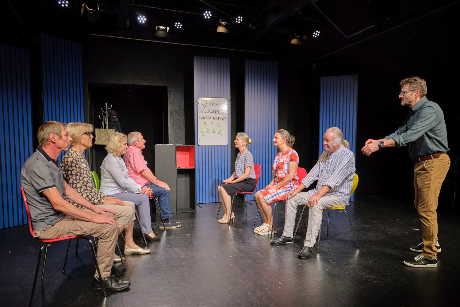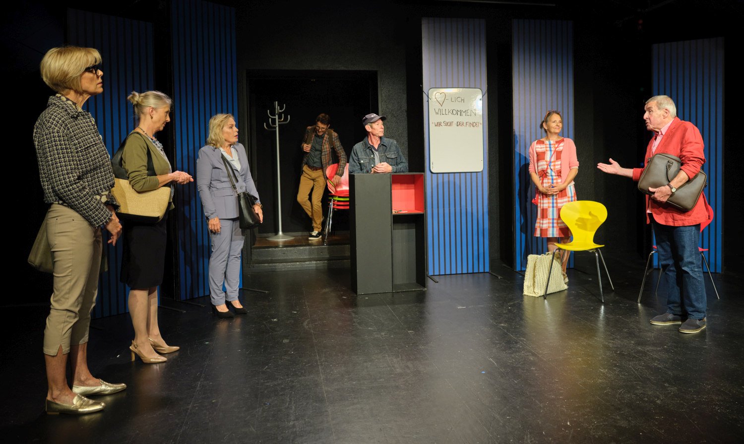 Zum StückSieben Menschen im fortgeschrittenen Alter schreiben sich für einen Kennenlernkurs ein, um endlich wieder einen Partner zu finden. Im Kurs an der Volkshochschule treffen sie auf einen Kursleiter, der seiner Aufgabe offensichtlich nicht gewachsen ist.