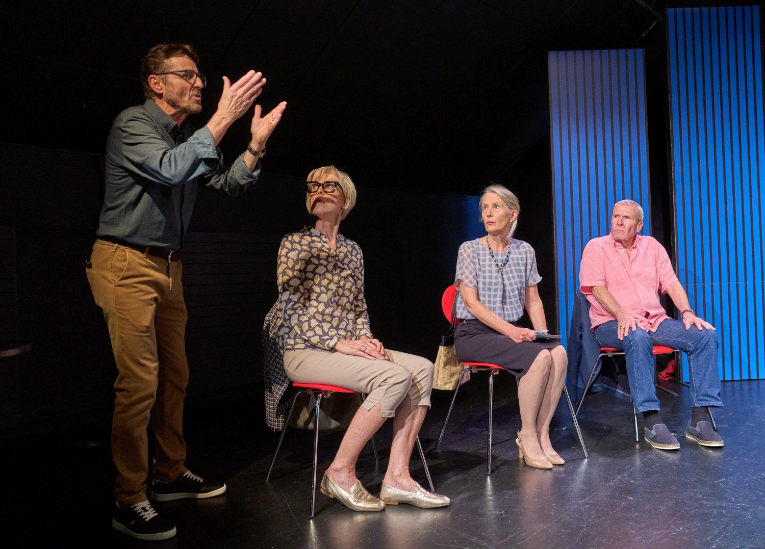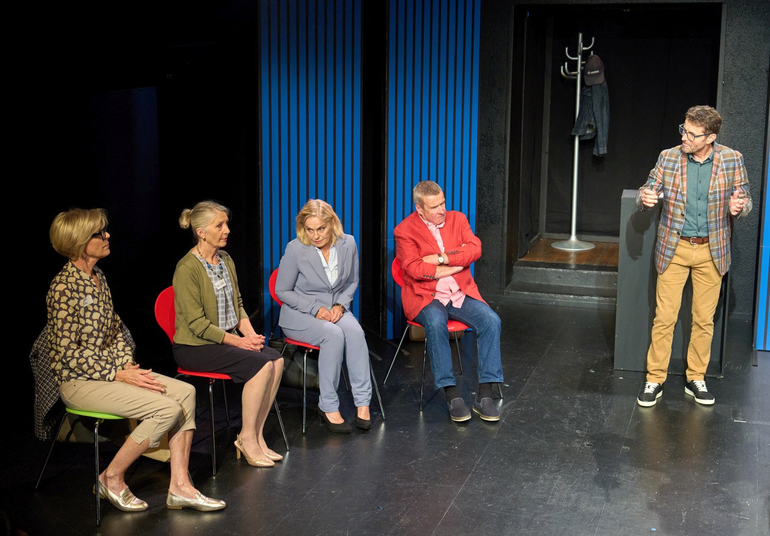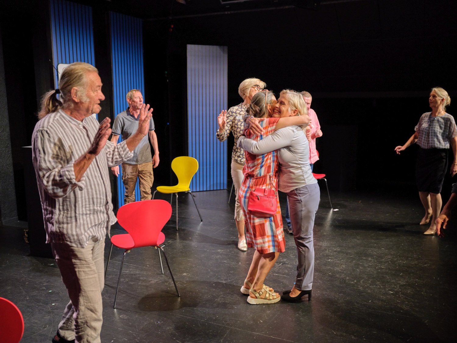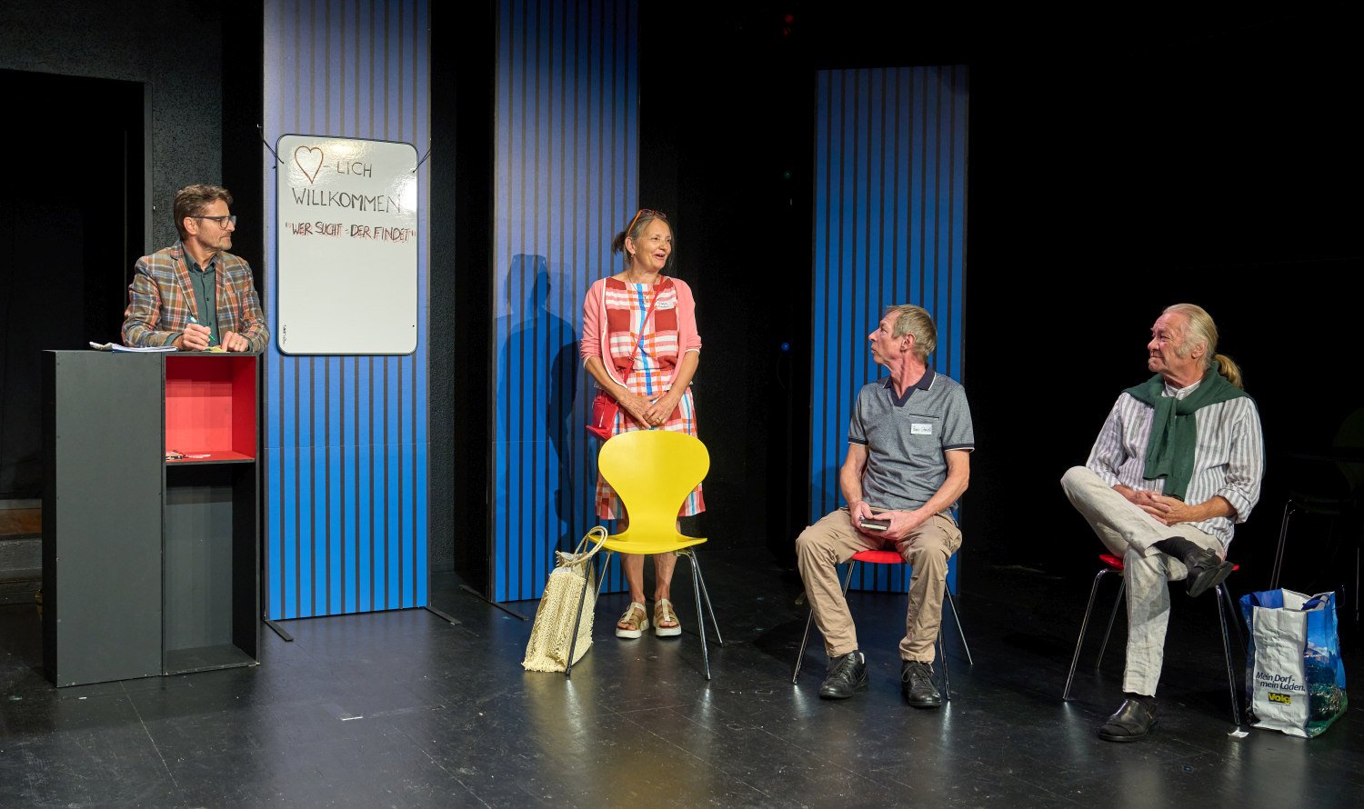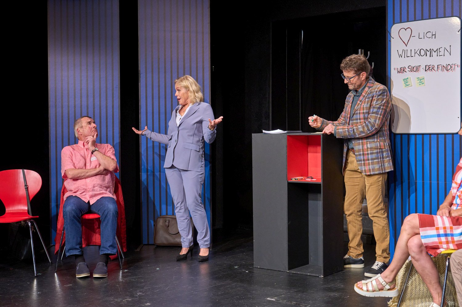 Zum StückSieben Menschen im fortgeschrittenen Alter schreiben sich für einen Kennenlernkurs ein, um endlich wieder einen Partner zu finden. Im Kurs an der Volkshochschule treffen sie auf einen Kursleiter, der seiner Aufgabe offensichtlich nicht gewachsen ist.